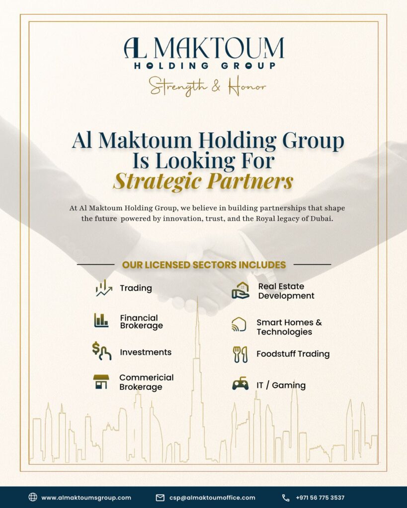 Today, Al Maktoum Holding Group invites Strategic Partners to join us in shaping tomorrow’s business landscape. Together, we can unlock new opportunities, elevate industries, and reinforce Dubai’s position as a global hub of progress and prestige.